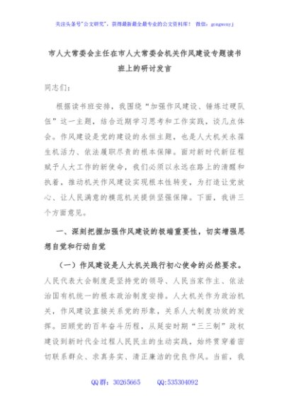 / 市人大常委会主任在市人大常委会机关作风建设专题读书班上的研讨发言