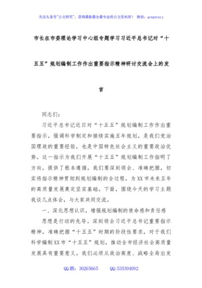 / 市长在市委理论学习中心组专题学习习近平总书记对“十五五”规划编制工作作出重要指示精神研讨交流会上的发言