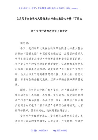 / 在某某市安全稳定风险隐患大排查大整治大排除“百日攻坚”专项行动推进会议上的讲话