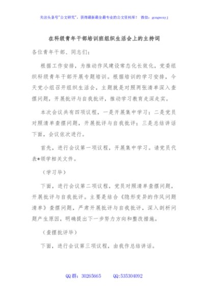 / 在科级青年干部培训班组织生活会上的主持词
