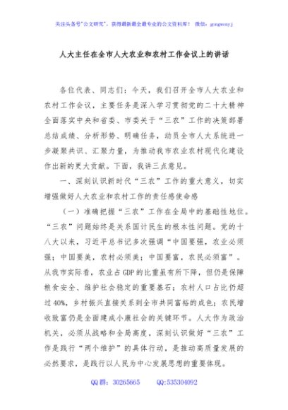 / 人大主任在全市人大农业和农村工作会议上的讲话