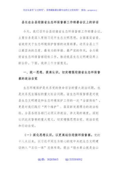 / 县长在全县迎接省生态环保督察工作部署会议上的讲话