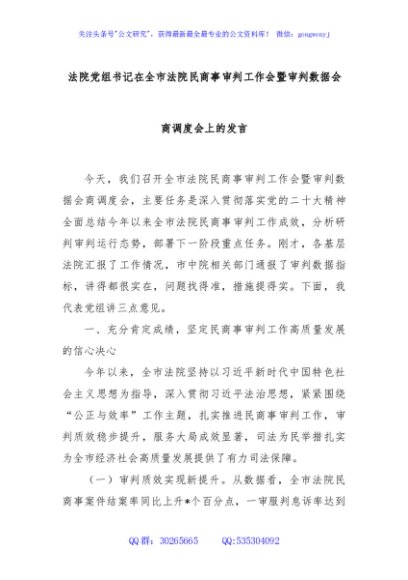 / 法院党组书记在全市法院民商事审判工作会暨审判数据会商调度会上的发言