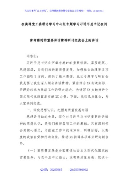 / 在街道党工委理论学习中心组专题学习习近平总书记在河南考察时的重要讲话精神研讨交流会上的讲话