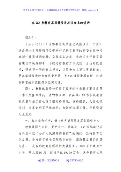 / 在XXX市教育高质量发展座谈会上的讲话