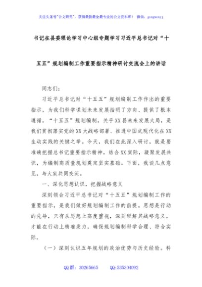 / 书记在县委理论学习中心组专题学习习近平总书记对“十五五”规划编制工作重要指示精神研讨交流会上的讲话