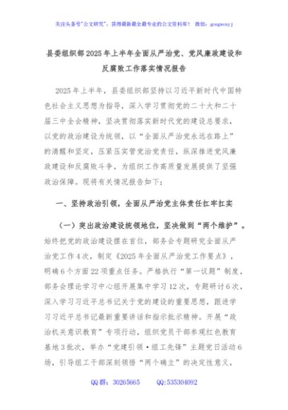 / 县委组织部2025年上半年全面从严治党、党风廉政建设和反腐败工作落实情况报告