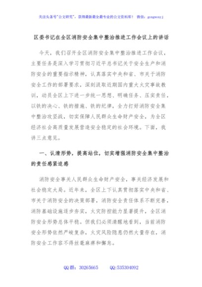 / 区委书记在全区消防安全集中整治推进工作会议上的讲话