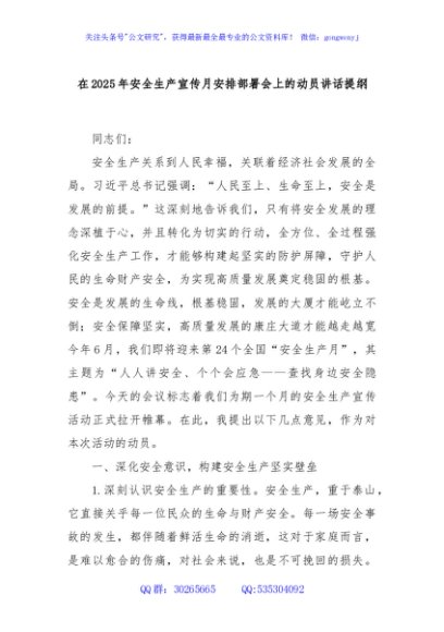/ 在2025年安全生产宣传月安排部署会上的动员讲话提纲
