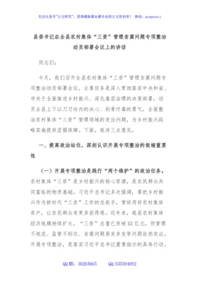 / 县委书记在全县农村集体“三资”管理贪腐问题专项整治动员部署会议上的讲话