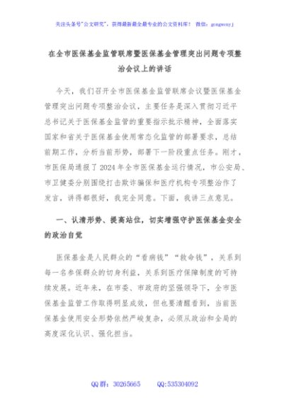/ 在全市医保基金监管联席暨医保基金管理突出问题专项整治会议上的讲话