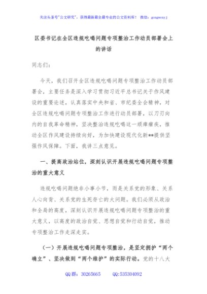 / 区委书记在全区违规吃喝问题专项整治工作动员部署会上的讲话