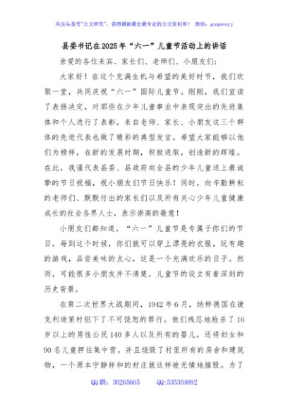 / 县委书记在2025年“六一”儿童节活动上的讲话