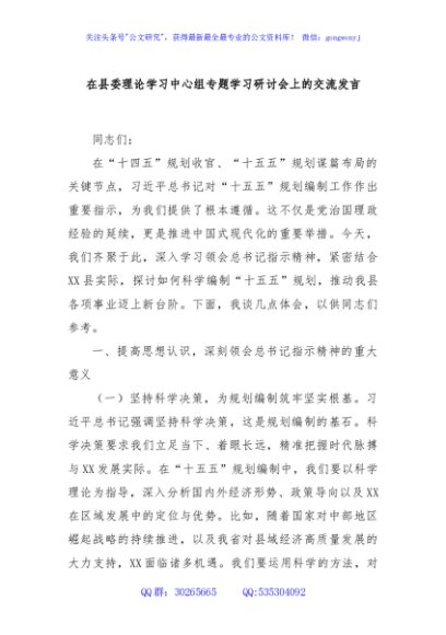 / 在县委理论学习中心组专题学习研讨会上的交流发言