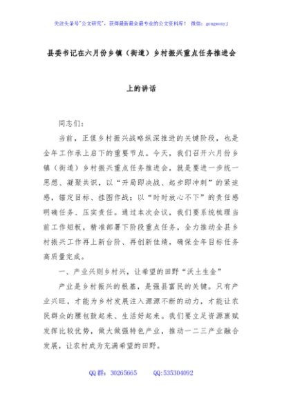 / 县委书记在六月份乡镇(街道)乡村振兴重点任务推进会上的讲话