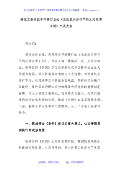 / 镇党工委书记学习修订后的《党政机关厉行节约反对浪费条例》交流发言