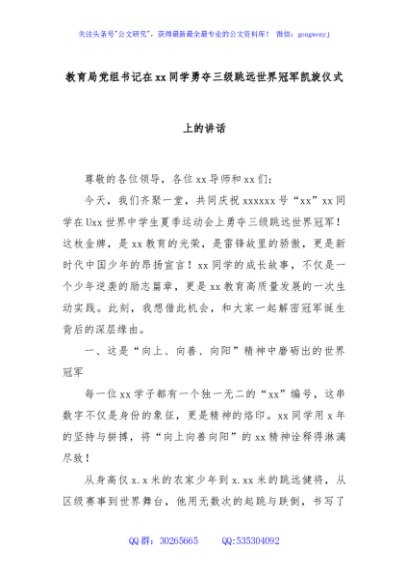 / 教育局党组书记在xx同学勇夺三级跳远世界冠军凯旋仪式上的讲话