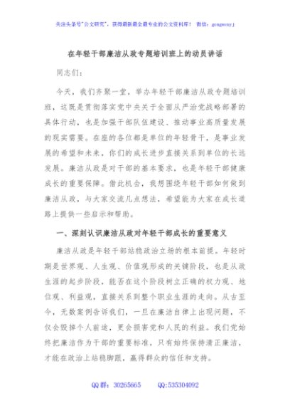 / 在年轻干部廉洁从政专题培训班上的动员讲话