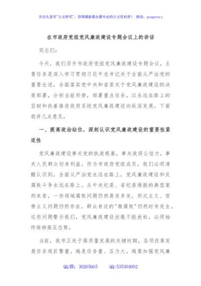 / 在市政府党组党风廉政建设专题会议上的讲话