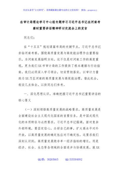 / 在审计局理论学习中心组专题学习习近平总书记在河南考察时重要讲话精神研讨交流会上的发言