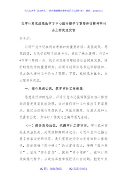 / 在审计局党组理论学习中心组专题学习重要讲话精神研讨会上的交流发言