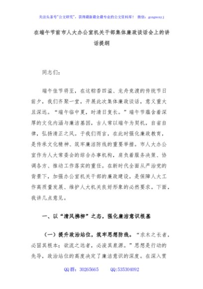 / 在端午节前市人大办公室机关干部集体廉政谈话会上的讲话提纲