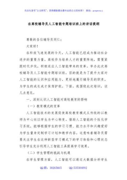 / 在高校辅导员人工智能专题培训班上的讲话提纲