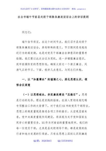 / 在全市端午节前县处级干部集体廉政谈话会上的讲话提纲