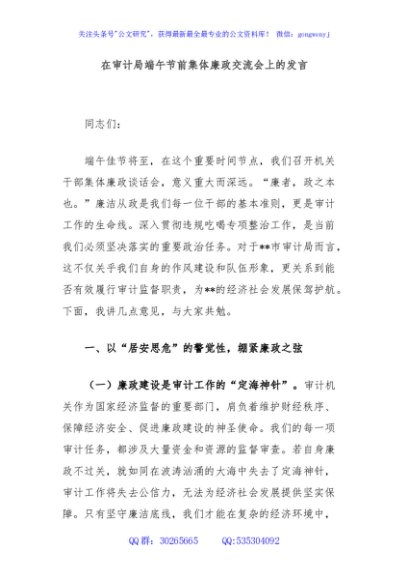 / 在审计局端午节前集体廉政交流会上的发言