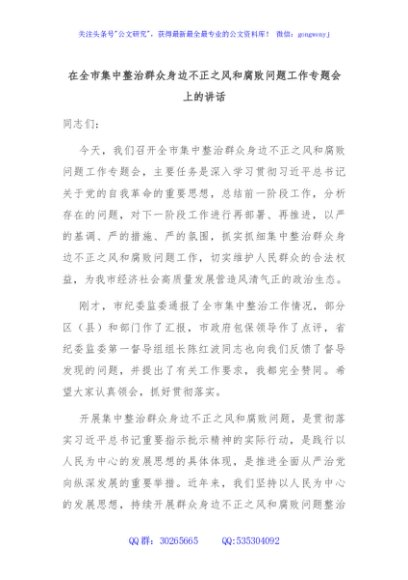 / 在全市集中整治群众身边不正之风和腐败问题工作专题会上的讲话