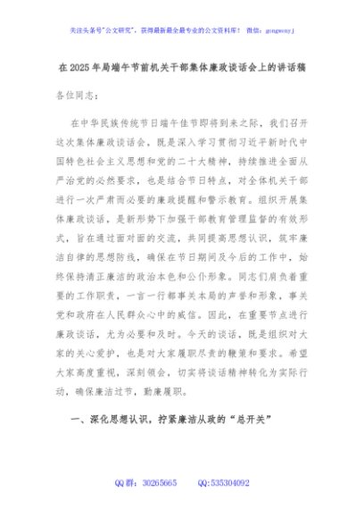 / 在2025年局端午节前机关干部集体廉政谈话会上的讲话稿