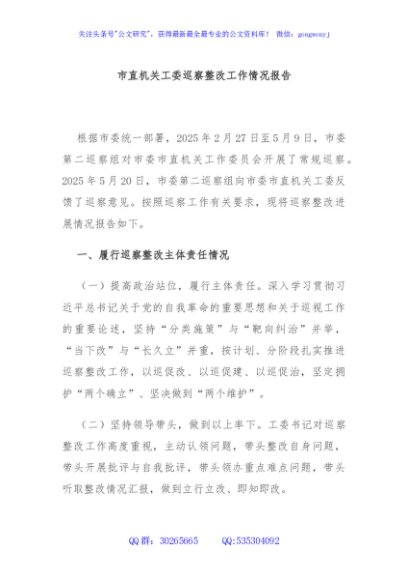 / 市直机关工委巡察整改工作情况报告