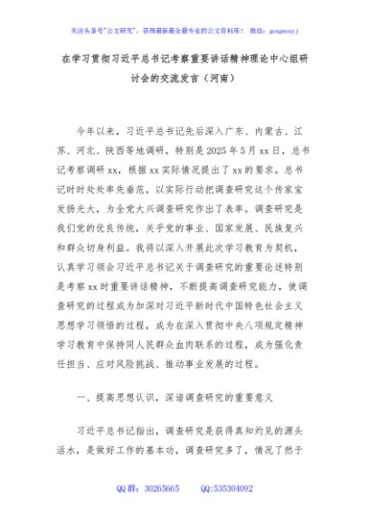 / 在学习贯彻习近平总书记考察重要讲话精神理论中心组研讨会的交流发言(河南)