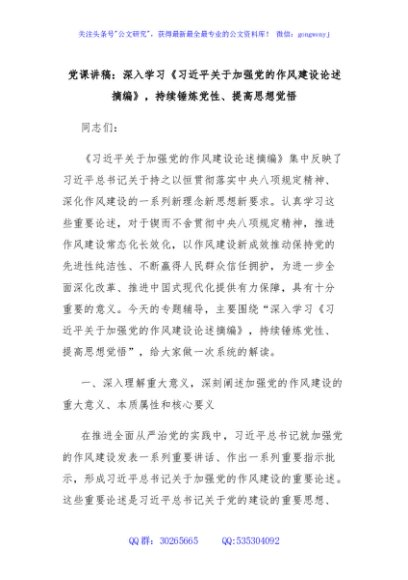 / 党课讲稿:深入学习《习近平关于加强党的作风建设论述摘编》,持续锤炼党性、提高思想觉悟