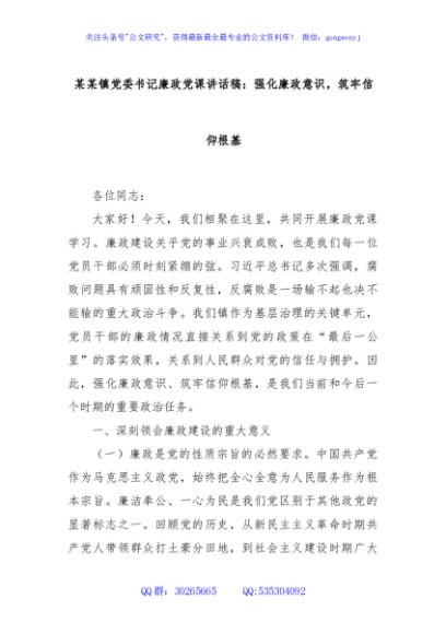 / 某某镇党委书记廉政党课讲话稿:强化廉政意识,筑牢信仰根基