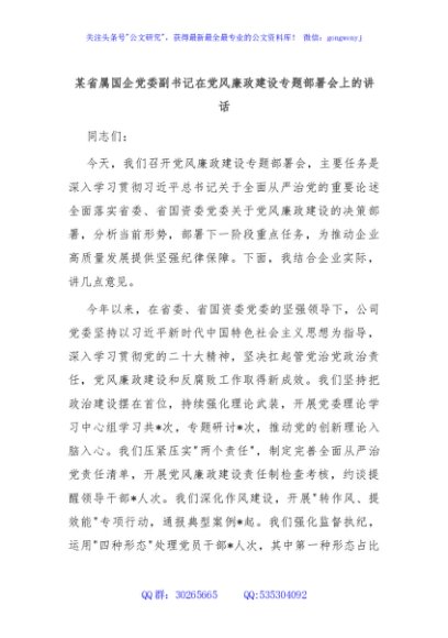 / 某省属国企党委副书记在党风廉政建设专题部署会上的讲话