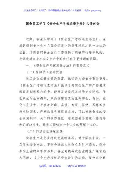 / 国企员工学习《安全生产考核巡查办法》心得体会