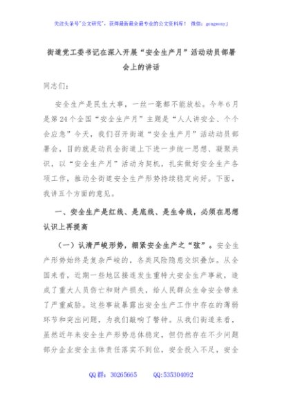 / 街道党工委书记在深入开展“安全生产月”活动动员部署会上的讲话