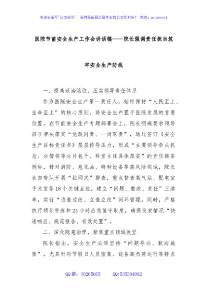/ 医院节前安全生产工作会讲话稿——院长强调责任担当筑牢安全生产防线