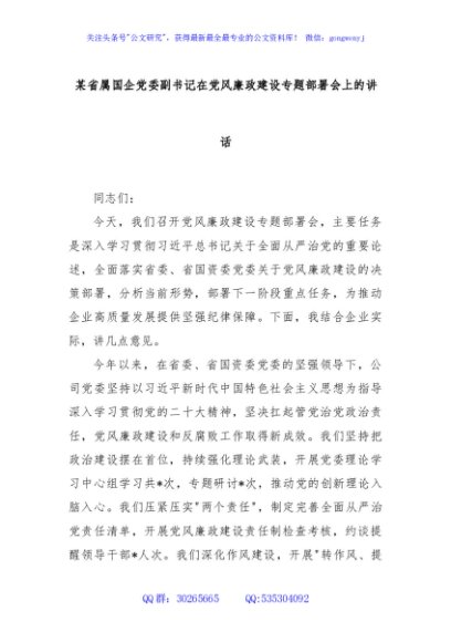 / 某省属国企党委副书记在党风廉政建设专题部署会上的讲话