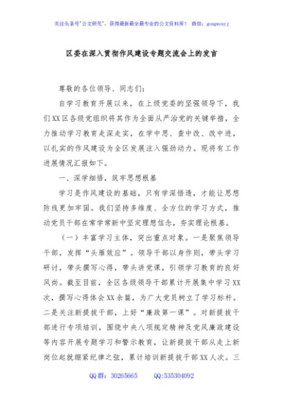 / 区委在深入贯彻作风建设专题交流会上的发言
