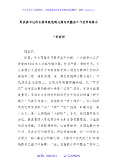 / 某县委书记在全县违规吃喝问题专项整治工作动员部署会上的讲话
