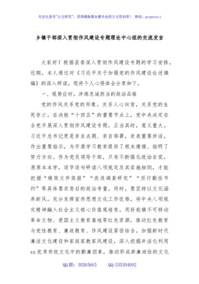 / 乡镇干部深入贯彻作风建设专题理论中心组的交流发言
