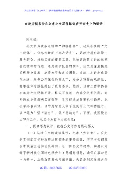 / 市政府秘书长在全市公文写作培训班开班式上的讲话