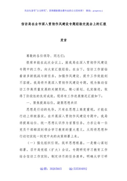 / 信访局在全市深入贯彻作风建设专题经验交流会上的汇报发言