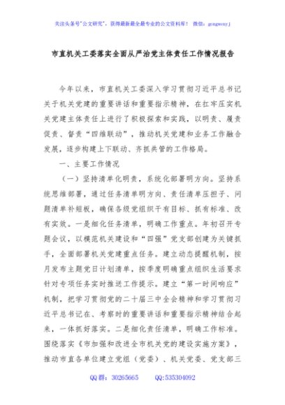 / 市直机关工委落实全面从严治党主体责任工作情况报告