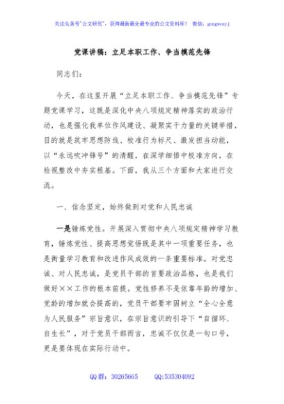 / 党课讲稿:立足本职工作、争当模范先锋