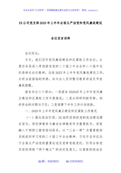 / XX公司党支部2025年上半年全面从严治党和党风廉政建设会议发言材料