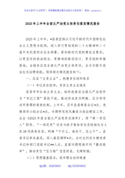 / 2025年上半年全面从严治党主体责任落实情况报告