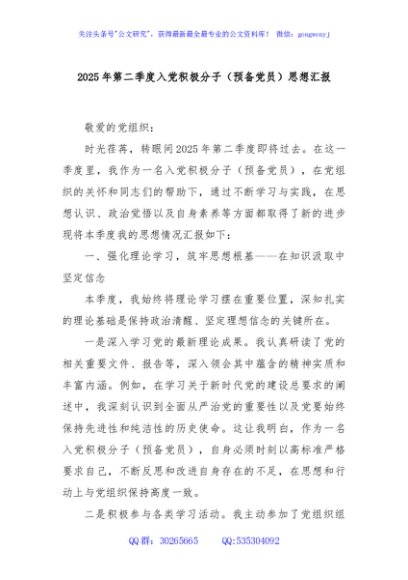 / 2025年第二季度入党积极分子(预备党员)思想汇报
